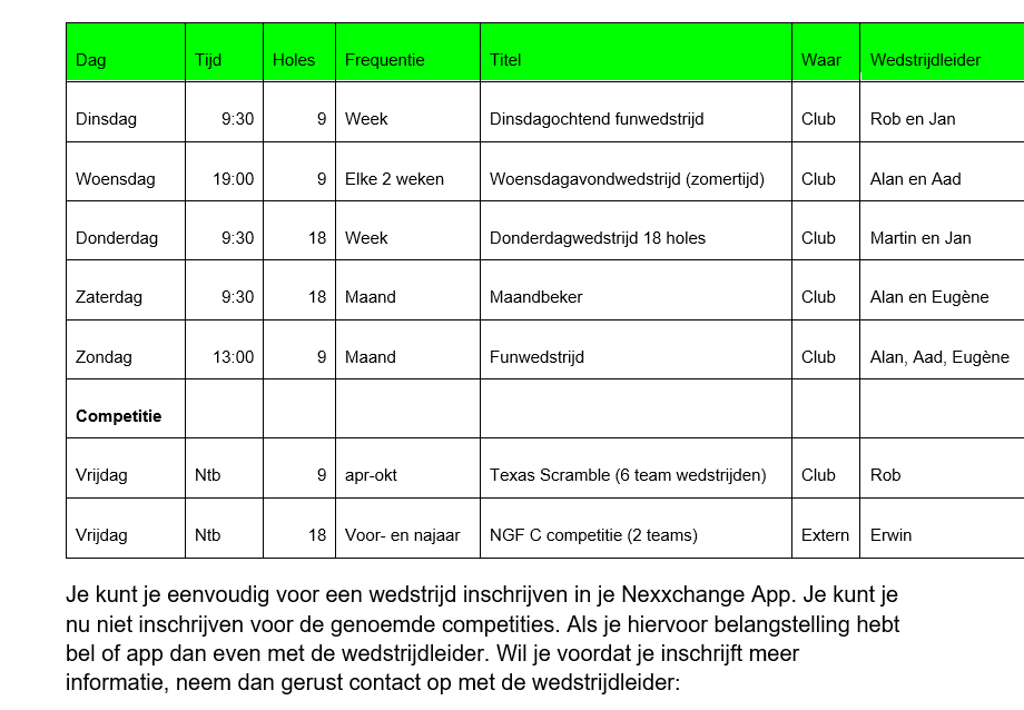 Hieronder volgt een lijstje van de wedstrijden die door de wedstrijdcommissie worden georganiseerd met daaraan gekoppeld de wedstrijdleider