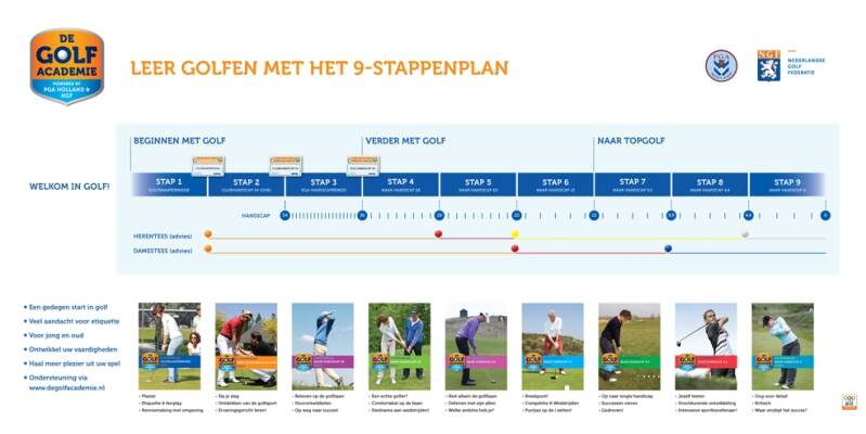 Met het 9-stappenplan hebben de PGA Holland en de NGF een methodiek ontwikkeld die elke golfer in de gelegenheid stelt om zelf te bepalen hoe hij/zij zichzelf wil ontwikkelen. Wil je plezier hebben op de golfbaan, dan kan dit al als je in stap 1 of stap 2 bent aangekomen.